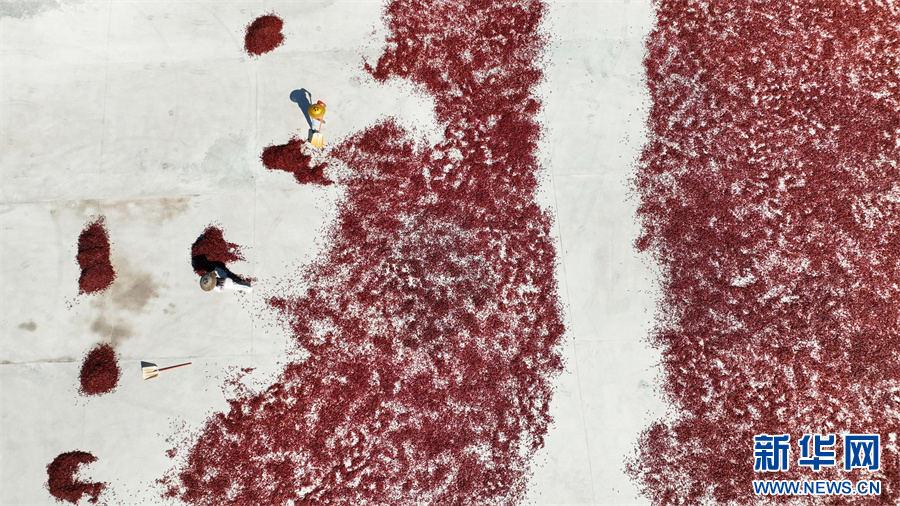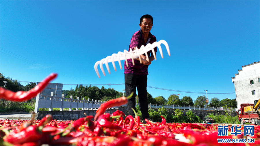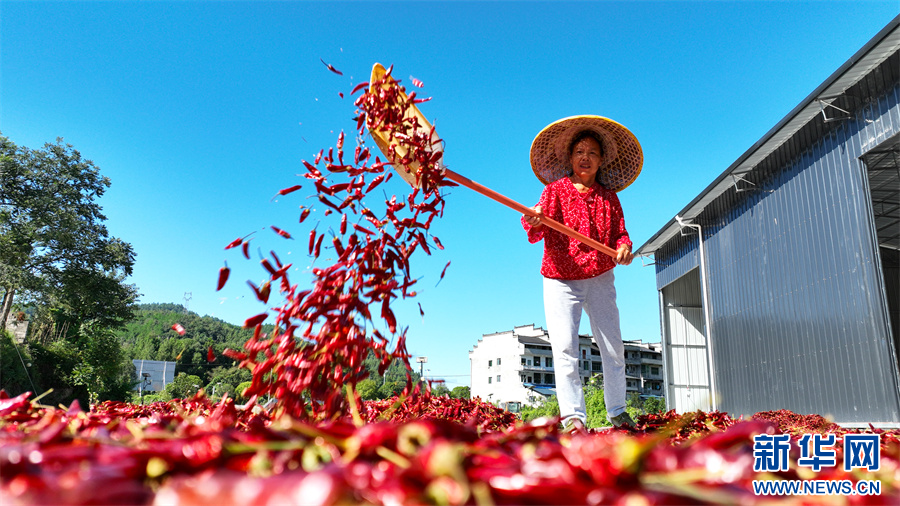 村民搶抓晴好天氣晾曬辣椒(8月25日拍攝)。新華網發(鐘勇 攝)