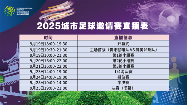 賽事期間,中央、省、市、縣四級主流媒體及咪咕視頻、喜馬拉雅、網易新聞等百余個新媒體平臺全程直播,咪咕視頻更提供360度全景直播信號,賽后還有全程回放。從開幕式的震撼開場,到貴陽主場首戰鋒芒初露;從小組賽的激烈交鋒,到終極對決的冠軍加冕,直至9月25日閉幕式的榮耀落幕——全程高能,不容錯過!