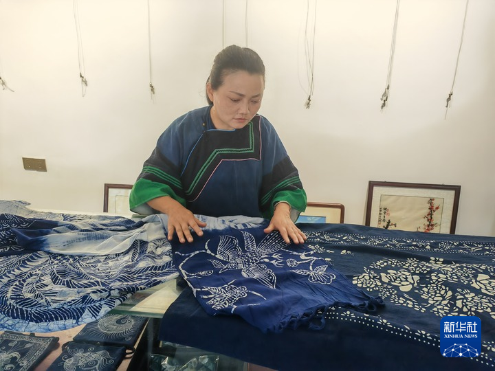楊麗在整理她收藏的黔繡作品。新華每日電訊記者汪軍攝