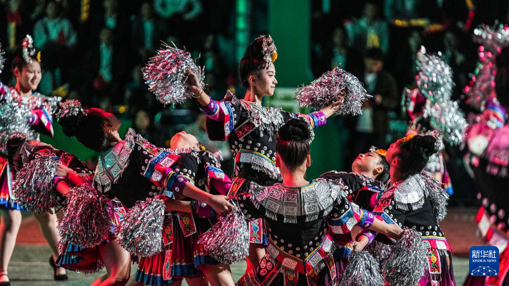4月13日,演員在啟動儀式上進行歌舞表演。當日,大地流彩·2025年全國和美鄉村籃球大賽(村BA)啟動儀式在貴州省黔東南苗族侗族自治州臺江縣臺盤村舉行。新華社記者 陶亮 攝