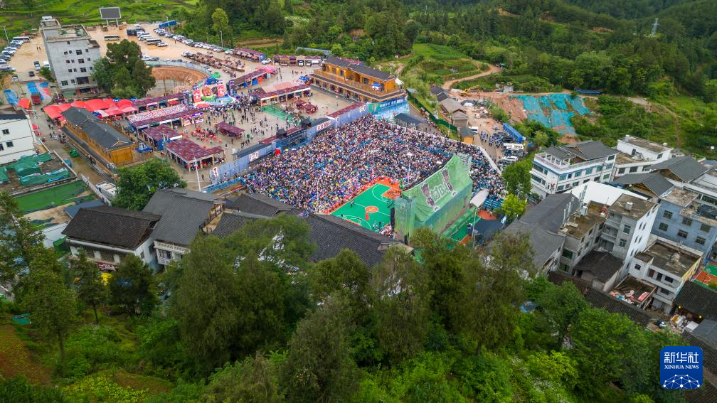 這是2024年6月9日拍攝的全國民族團結籃球邀請賽現場(無人機照片)。當日,第十二屆全國少數民族傳統體育運動會“同心暢享”系列活動之一的全國民族團結籃球邀請賽在貴州省黔東南苗族侗族自治州臺江縣臺盤村開賽。揭幕戰在貴州道真隊和河北寧晉隊之間展開。新華社發(龍建睿攝)