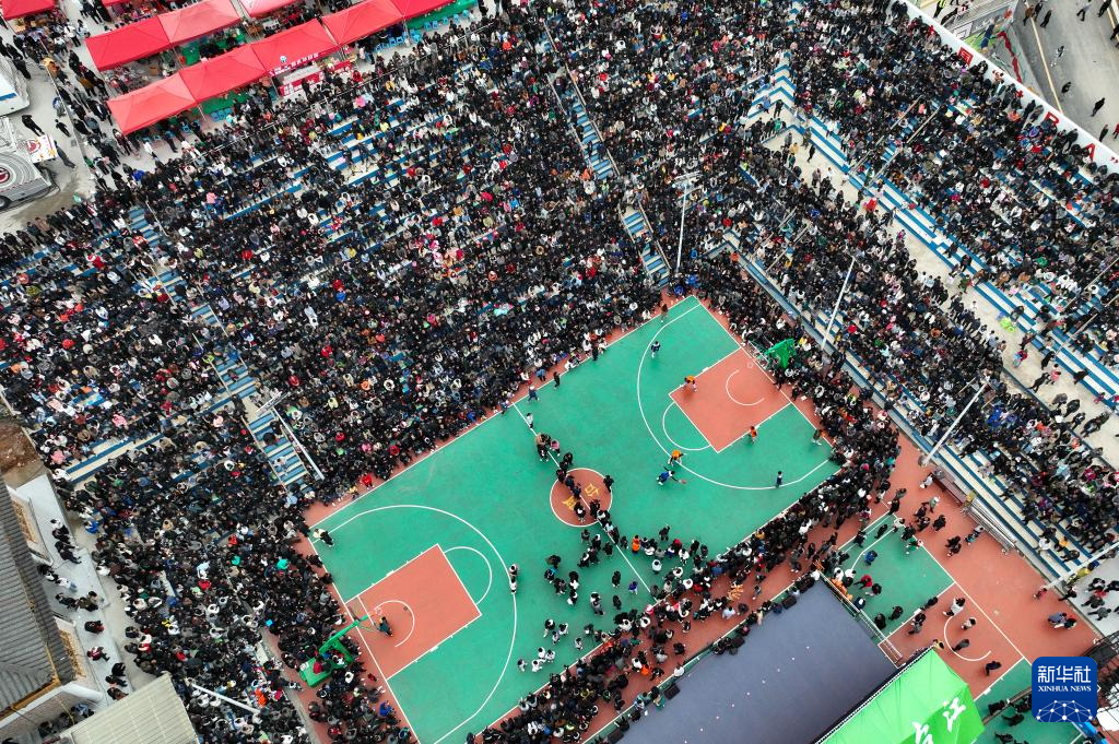 2023年3月25日,村民們在決賽前抵達現場觀看暖場比賽(無人機照片)。當日,貴州省首屆“美麗鄉村”籃球聯賽總決賽在黔東南州臺江縣臺盤村開打。這項由臺盤村“六月六”吃新節籃球賽發展而來的賽事因為火熱的現場氛圍和“接地氣”的辦賽風格,在2022年“火爆全網”,被網友親切地稱為“村BA”。新華社記者 劉續 攝