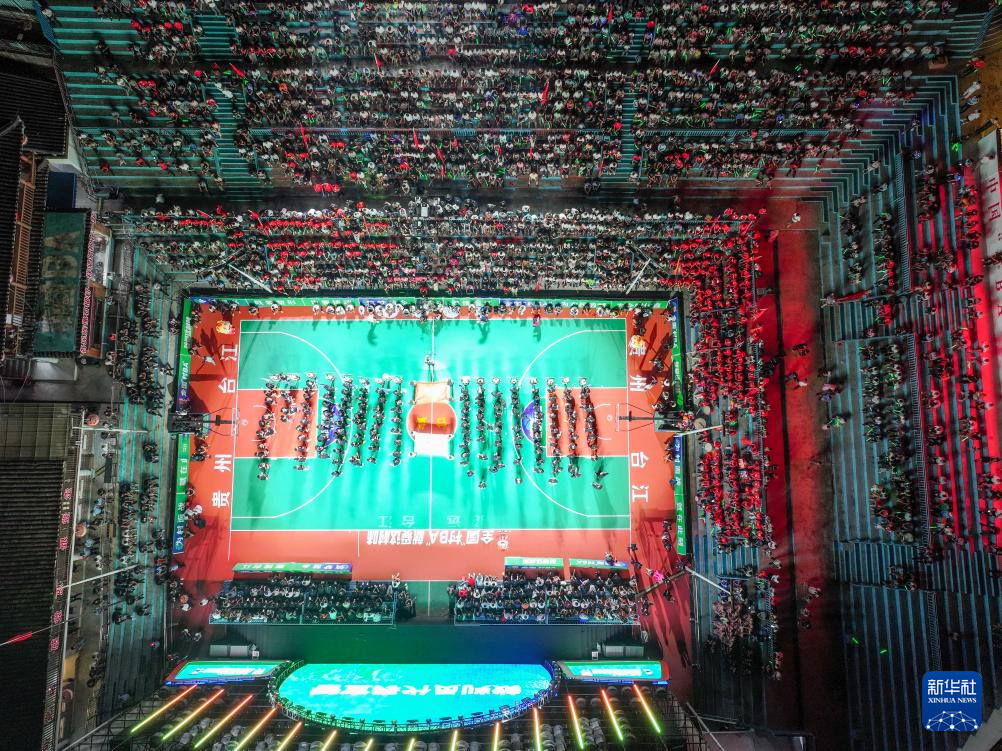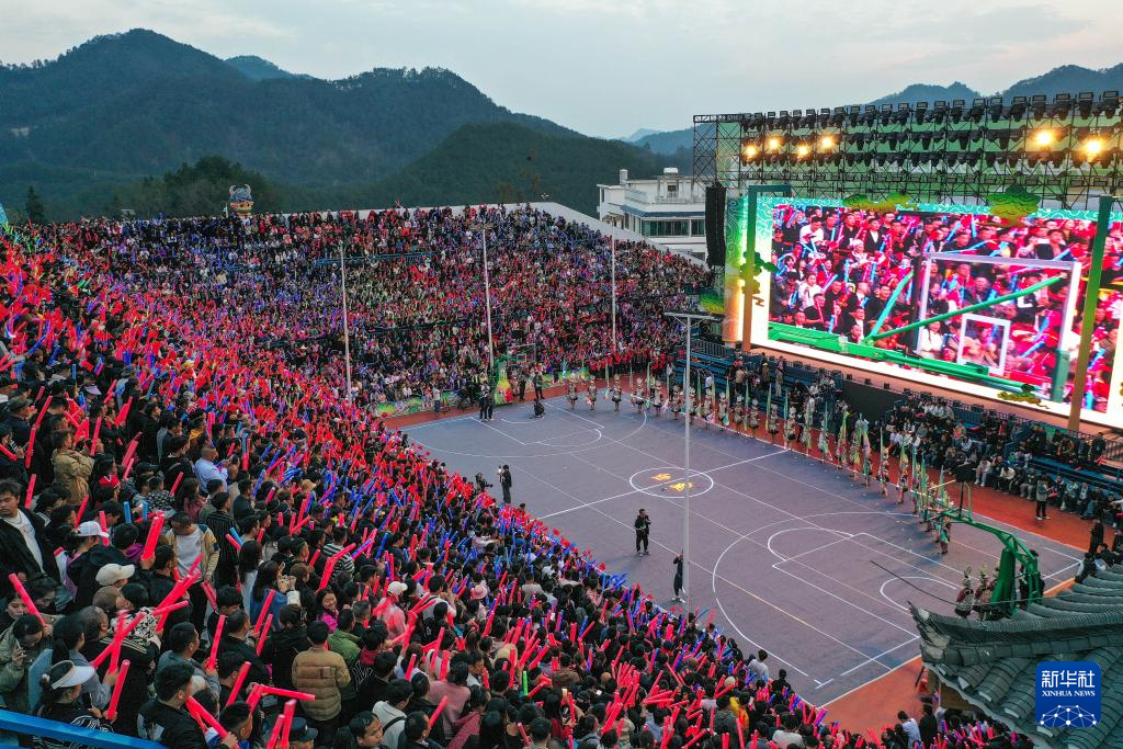 這是2024年3月22日拍攝的2024年鄉村籃球球王爭霸賽開幕式現場(無人機照片)。當日,以“活力四射 迎‘籃’而上”為主題的2024年鄉村籃球球王爭霸賽開幕式在貴州省黔東南苗族侗族自治州臺江縣臺盤村舉行。本次比賽將從3月持續到11月,是一次跨度長、范圍廣的全新賽事。新華社記者 楊文斌 攝