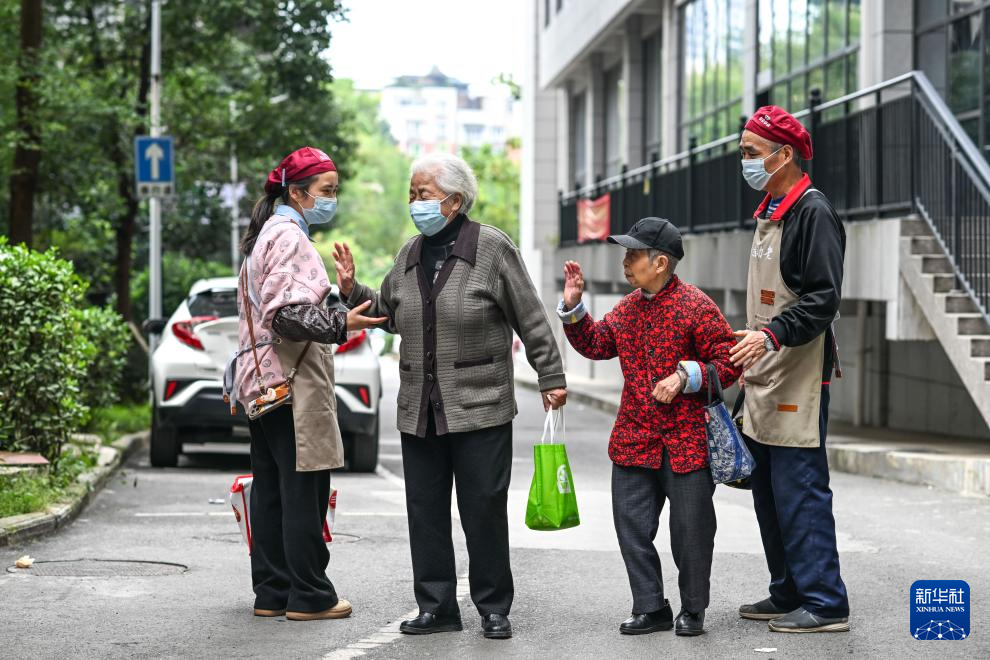 在貴陽市南明區紅巖東郡社區,志愿者尹曉宣(左一)、王天能(右一)在給行動不便的老人上門送餐歸來途中,與路遇的老人交流(10月24日攝)。