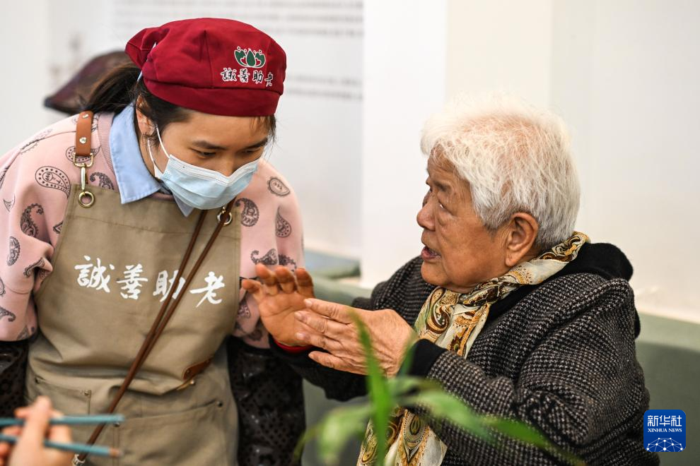 在貴陽市南明區紅巖東郡社區誠善助老公益互助服務點,青年志愿者尹曉宣(左)在傾聽就餐老人訴求(10月24日攝)。