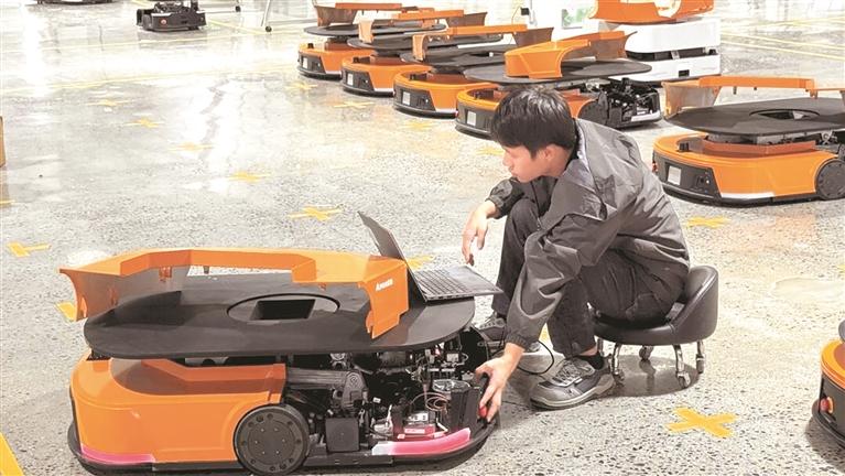 11月1日,貴安新區威邁爾科技有限公司生產車間內,一臺臺生產完成的潛伏式機器人正在進行出廠前的性能測試。該系列機器人運用自研的3D視覺感知技術,可自主完成導航、避障、對接等動作,精準地將零部件運送至指定工位。