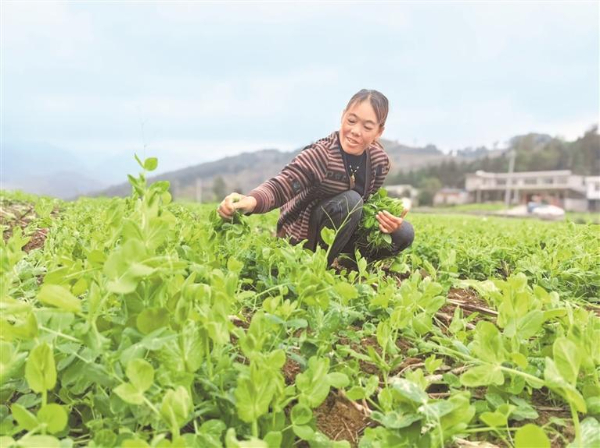 在長崗鎮堰頭村的豌豆尖種植基地,一壟壟綠油油的豌豆苗長勢喜人,村民們彎腰穿梭于田間,雙手翻飛,熟練地掐下嫩綠的尖芽,不一會兒,筐里便堆滿了新鮮采摘的豌豆尖?!敖衲晖愣辜庑星榉浅:?,4.5元/斤,我們一天摘的豌豆尖能賣500多元,而且我們摘來放路邊,村里面會安排人來稱重裝車拉走?!比蕬咽虚L崗鎮堰頭村村民蔡啟應說。